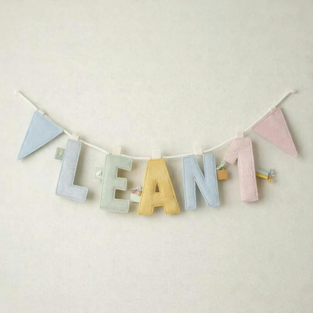 Create your own garland for your baby or as a gift. The perfect personalized decoration for the nursery, made from soft fabric. Choose from various letters (AZ), numbers (0-10), and cute ornaments and pennants in enchanting colors to design your very special garland.